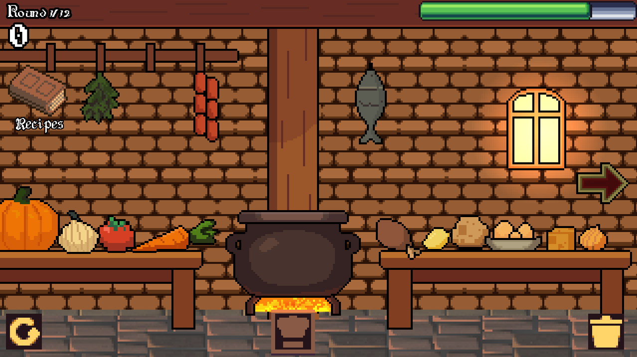 Drop the ingredients into the cauldron in the SAME ORDER as listed on the recipe. Ingredients cannot be added twice and the cauldron holds a maximum of 4 ingredients. If the mixture does not match any recipe + you press cook, the cauldron will clear itself. To manually clear the cauldron, please press the trash button on the right.